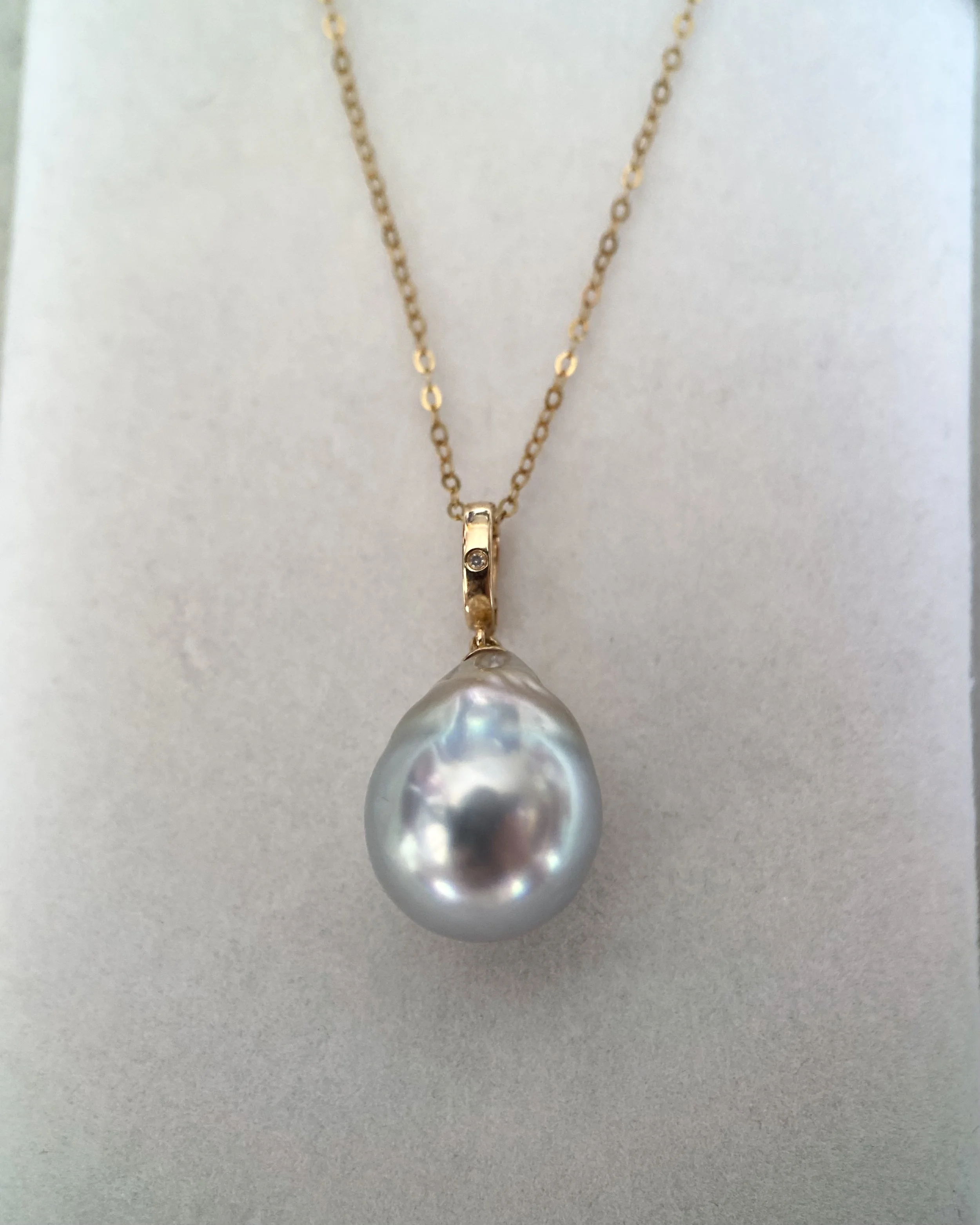 Rare 14.2mm Australian South Sea Cultured Baroque Pearl Pendant, Silver Hue with Aurora-Like Iridescence and Radiant Lustre, 18K/AU750 Solid Yellow Gold with D0.003CT Real Diamond Openable Fitting – A Unique Treasure
