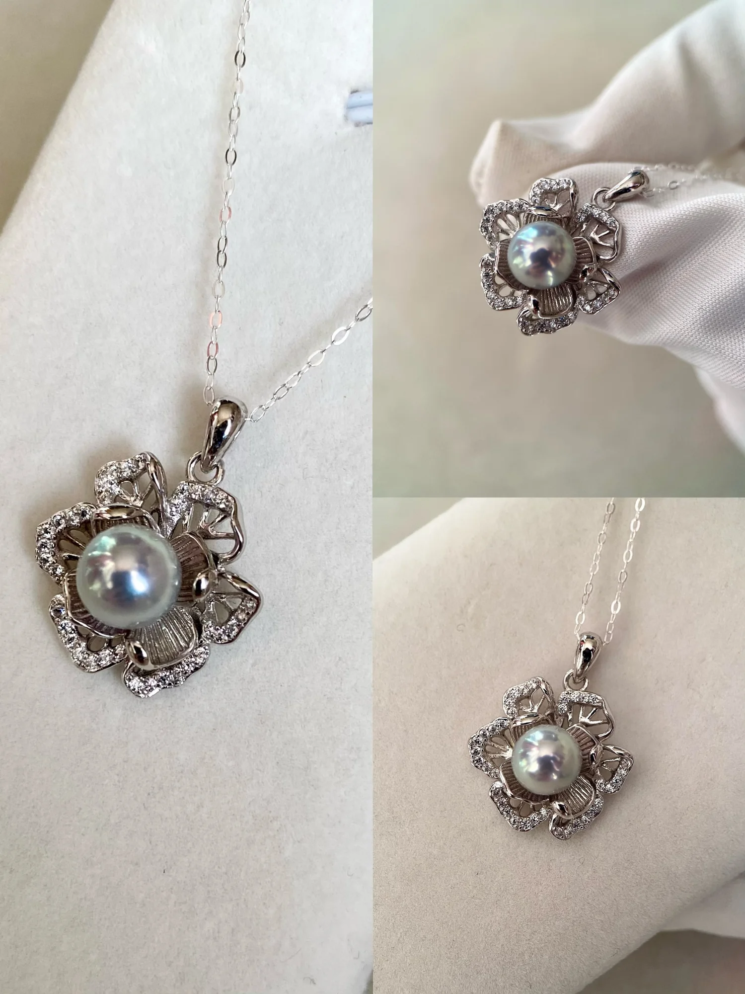 Top-Quality 7-7.5mm Japanese Madama Akoya Pearl Pendant, Silver-Grey with Rare Green Pink Overtones, Sakura Openwork Design, Made in Japan