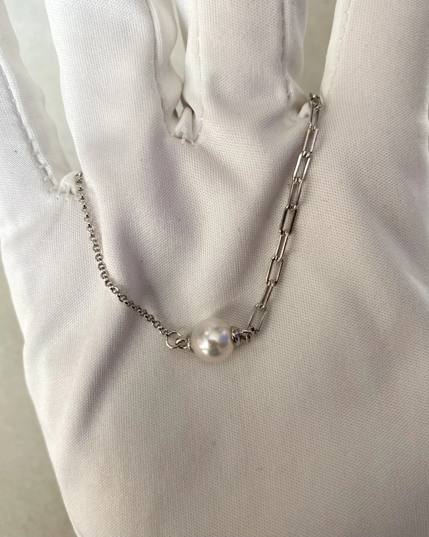 This bracelet features a charming asymmetrical chain design, artfully combining two distinct styles of links to create a fresh and visually layered look. One side of the pearl is anchored by a delicate mini round chain that exudes a sense of gentle minimalism, while the other side contrasts with a sleek, rectangular paperclip-style chain, adding a touch of architectural rhythm and light geometry.