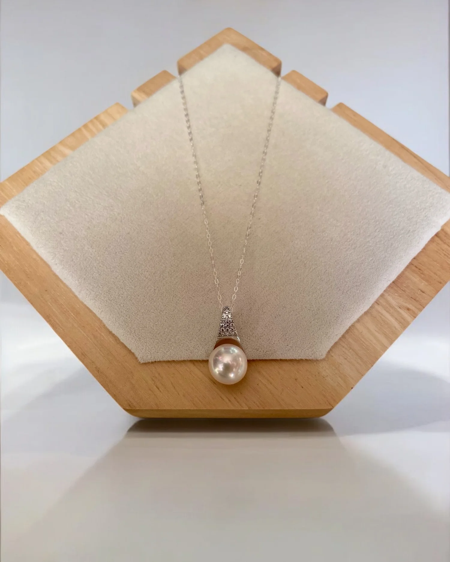 Featured at the prestigious Hong Kong International Jewellery Exhibition, this pendant's sleek, flowing lines cradle the pearl like a delicate wave. The design not only enhances the natural beauty of the pearl but also adds a dynamic aesthetic that catches light from every angle, drawing attention to its radiant qualities.
